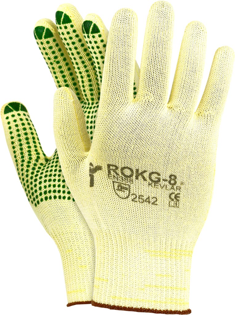 Robuste Kevlar®-Schutzhandschuhe mit herausragender Schnittfestigkeit, PVC-Beschichtung für verbesserten Griff und Zertifizierung nach EN388 und EN420.