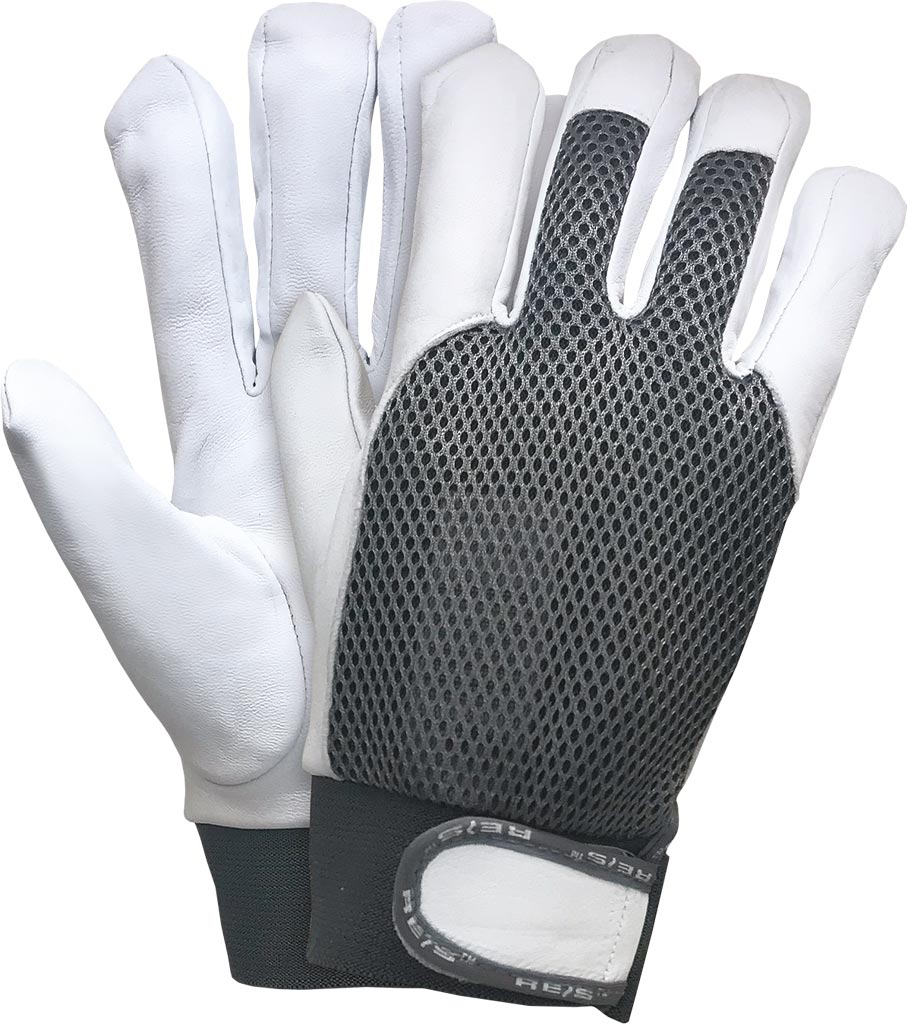 Hochwertige Ziegenlederhandschuhe mit Belüftungsnetz, ideal für mechanische Arbeiten und Führungskräfte. Verstellbarer Verschluss für optimalen Schutz.