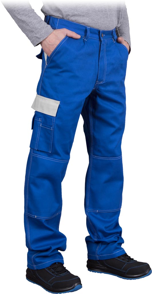 Robuste Herren-Schutzhose aus 100% Baumwolle, mit diversen Taschen, einschließlich Handyfach und Schlüsselanhänger, sowie kniepolstertauglich.
