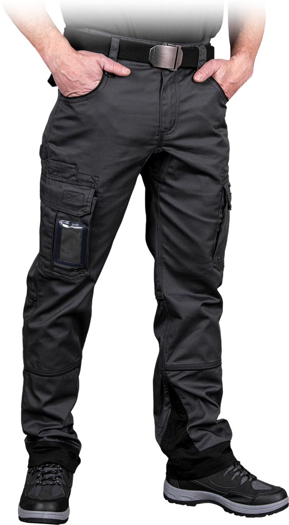 Die Hose verfügt über praktische Details, wie einen Knopf- und Reißverschluss, zwei seitliche Taschen, zwei rückwärtige Klettverschlusstaschen und zusätzliche Beintaschen für Werkzeuge und Kleinmaterial. Ein schmaler Schlitz auf der rechten Beinseite dient zur Aufbewahrung eines Stiftes oder eines Ausweises. Die seitlichen Gummieinsätze im Bund fördern die Bewegungsfreiheit und sorgen für eine perfekte Passform. Zu den weiteren Merkmalen gehören eine Schlaufe für Schlüssel und ein Halter für Werkzeuge.