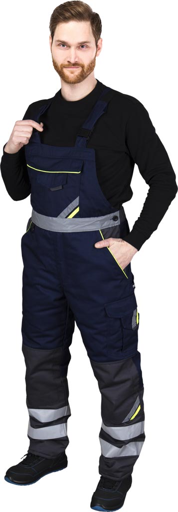Thermogefütterte Schutz-Latzhose mit vielfältigen Taschen, optimaler Passform und reflektierenden Sicherheitsstreifen. Erfüllt EN ISO 20471 und EN ISO 13688.