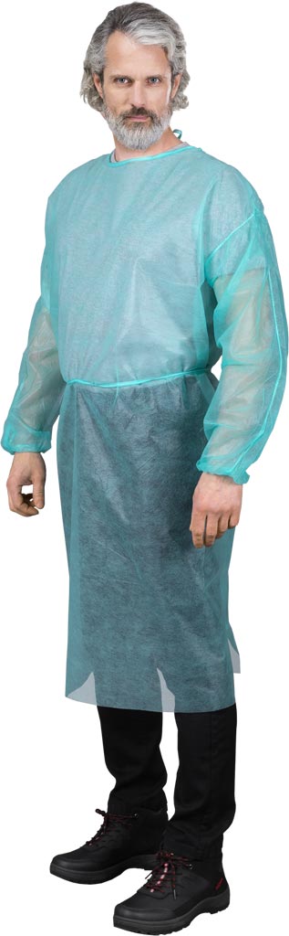 High-quality, lightweight polypropylene apron, 22 g/m2, with practical tie-backs and elastic sleeve bands for secure fit. Ideal for various professional settings.
