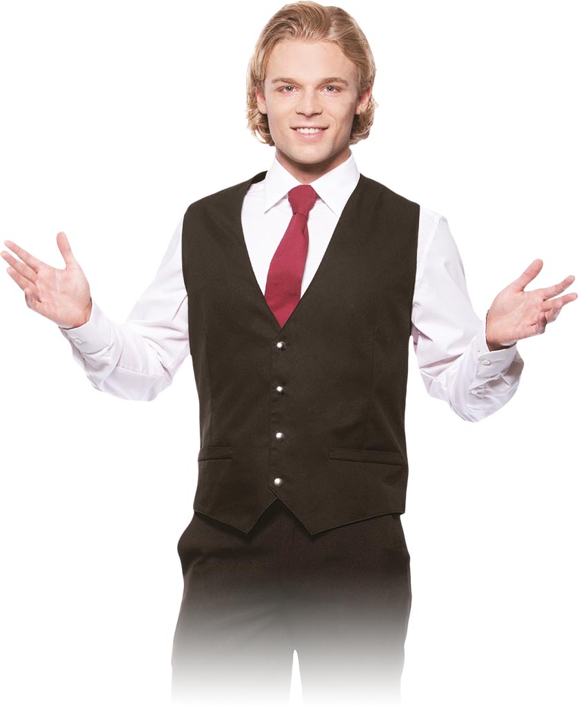 Men's polyester-cotton blend waiter vest with snap fasteners, adjustable waist, and elegant tailoring. Washable at 95°C.