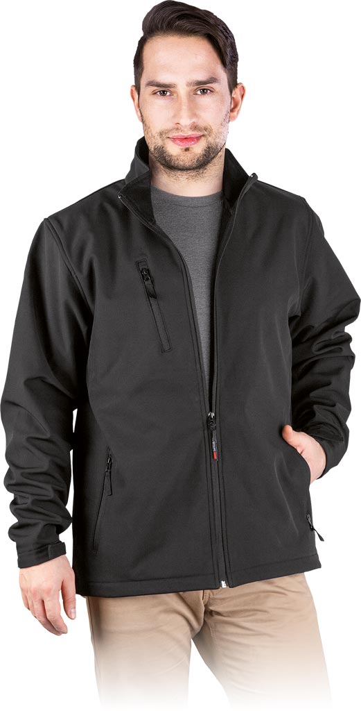 Men’s waterproof, windproof jacket with 300g/m2 softshell material, full zip, stand-up collar, and secure pocket storage.