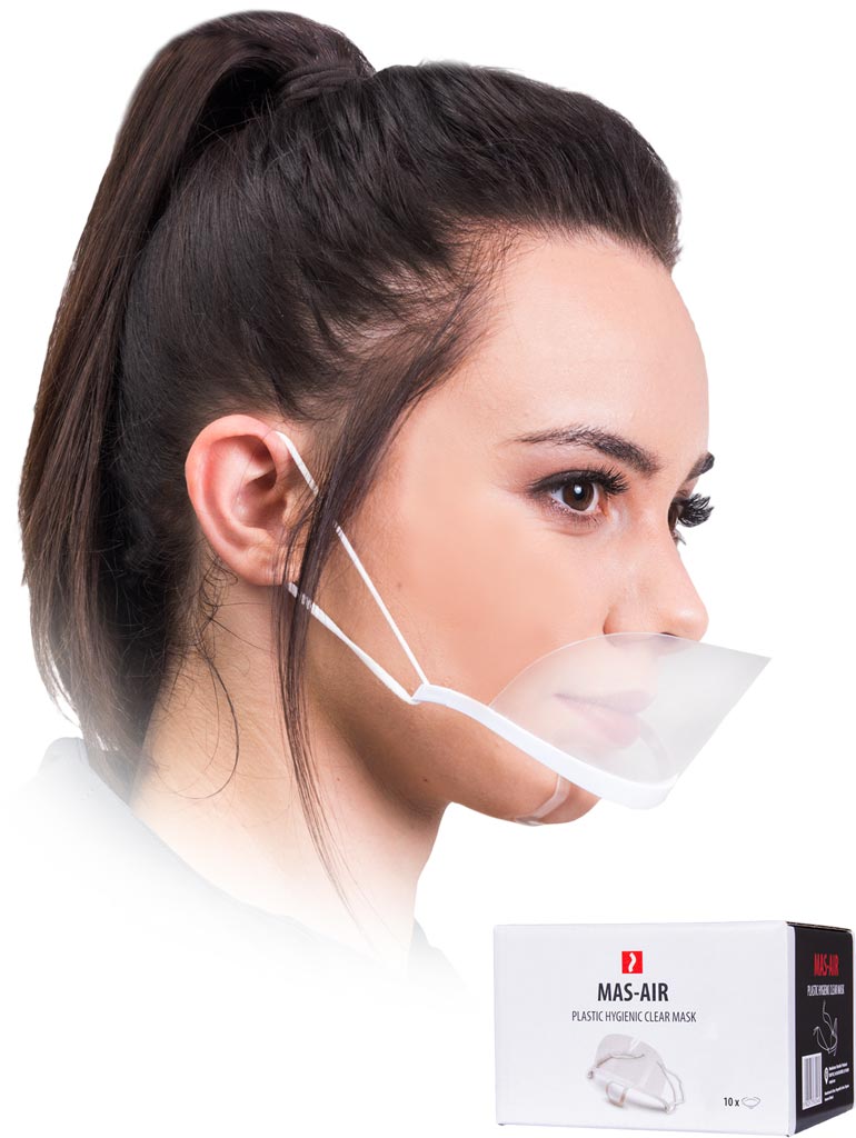 Clear, comfortable polyester hygienic mask with adjustable straps and chin pad. Not for respiratory protection. Pack of 10.