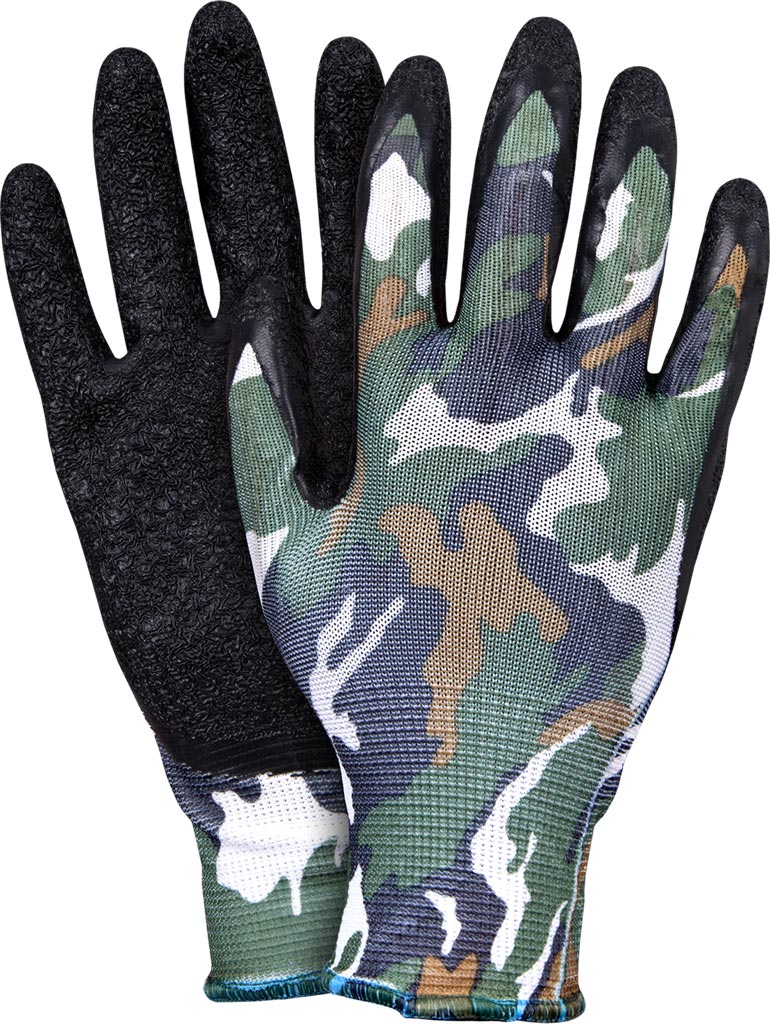 Durable, stretchy polyester gloves coated in latex, featuring a ribbed cuff and porous structure for excellent grip without stiffness.