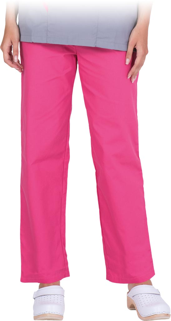 Spodnie wyposażone są w zewnętrzną kieszeń z tyłu, co jest praktycznym rozwiązaniem do przechowywania drobnych przedmiotów. Dodatkowy komfort zapewniają troczki oraz elastyczna gumka w pasie, które pozwalają na idealne dopasowanie spodni do sylwetki. Te cechy czynią je idealnym wyborem dla profesjonalistek z branży kosmetycznej, medycznej oraz chemicznej, szczególnie tych pracujących w laboratoriach.