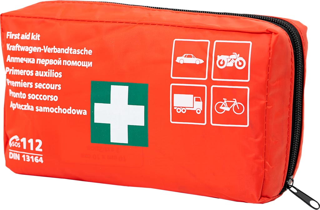 Kompaktowa i kompletna apteczka samochodowa, zgodna z normą DIN 13164:2022, wykonana z wodoodpornej tkaniny. Zawiera wszystkie niezbędne elementy do udzielenia pierwszej pomocy.