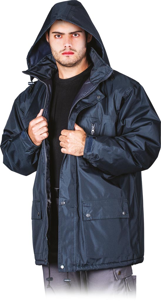 Ocieplana kurtka męska z poliestru pongee, powlekana PVC. Kaptur chowany, kieszenie, regulacja rękawów i dół na troczki.