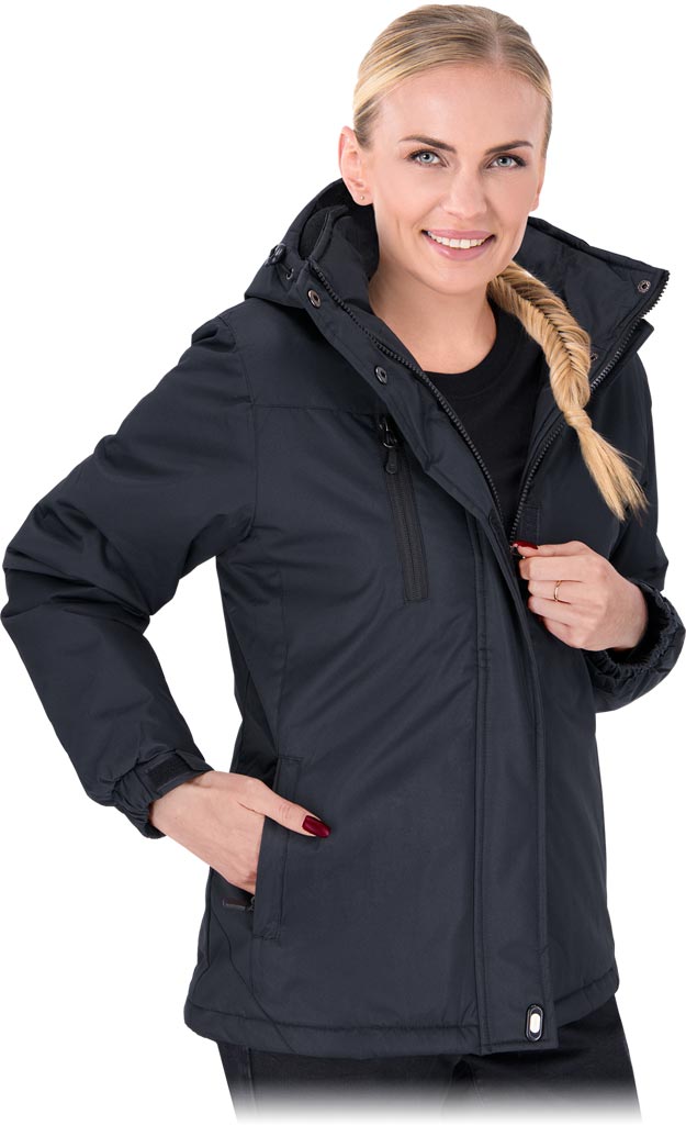 Damska kurtka ochronna ocieplana z polarową podszewką, odpinanym kapturem, regulowanymi rękawami i funkcjonalnymi kieszeniami.