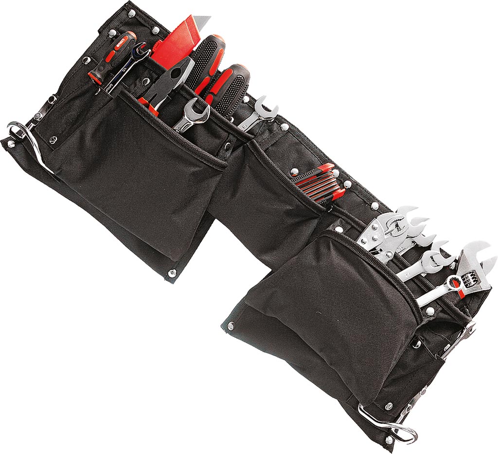 Wytrzymały pas monterski z podwójnymi kieszeniami to niezbędne wyposażenie dla każdego profesjonalisty. Wykonany z mocnego materiału zapewnia długotrwałe użytkowanie i odporność na uszkodzenia. Pas posiada łącznie dziesięć kieszeni: dwie duże i osiem mniejszych, co umożliwia łatwy dostęp do wszystkich narzędzi. Dodatkowa kieszeń pomiędzy większymi kieszeniami jest idealna do przechowywania drobnych elementów takich jak gwoździe.