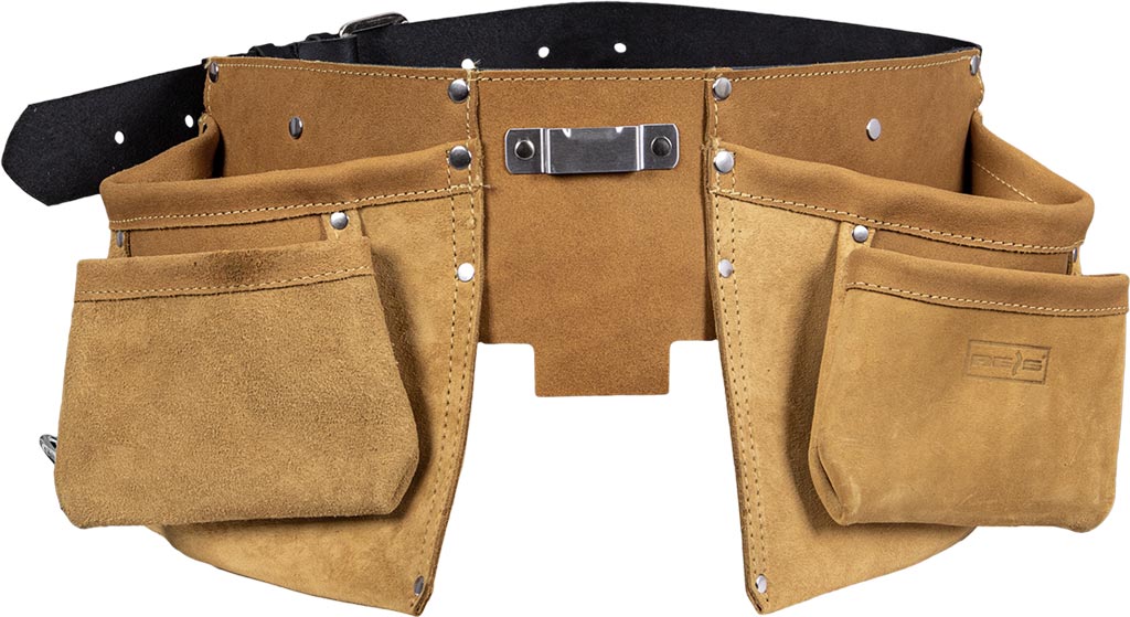 Skórzany pas monterski z 10 funkcjonalnymi kieszeniami, uchwytami na młotek i miarkę, wykonany z trwałej dwoiny bydlęcej.