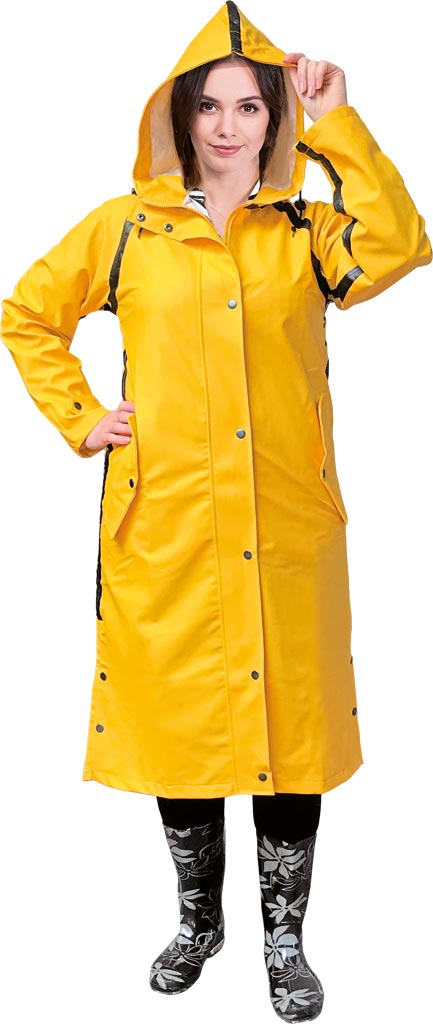 Damski płaszcz przeciwdeszczowy z kapturem, zapinany na suwak z dodatkowymi zapięciami na napy, w 100% ochronny przed deszczem.