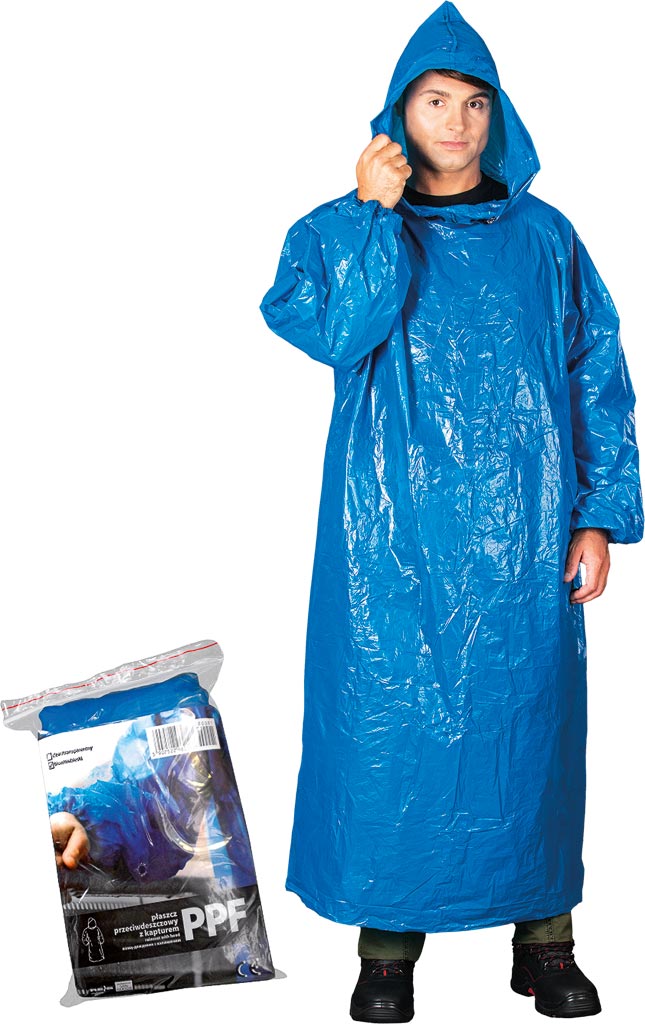 Płaszcz przeciwdeszczowy z kapturem, 100% polietylen, rękawy z ściągaczem, spełnia normę EN343.