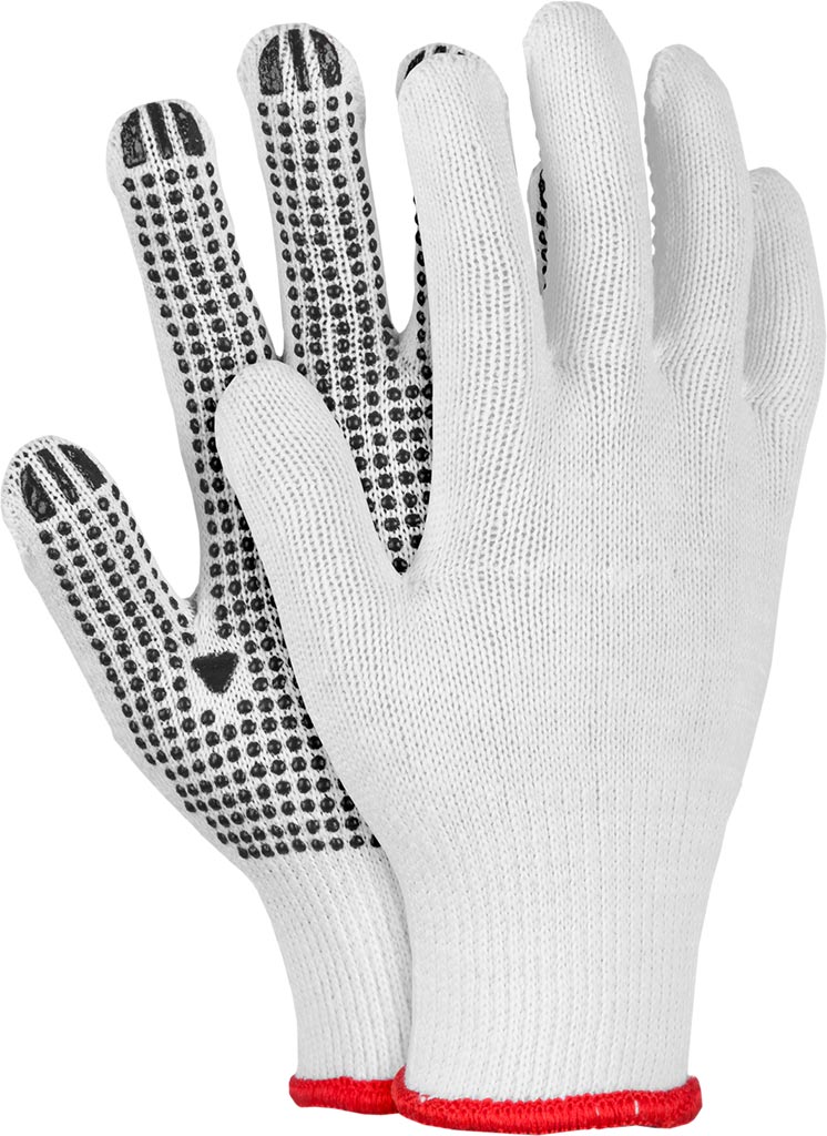 Rękawice ochronne z mieszanki poliestru i bawełny z nakropieniem PCV, zwiększające chwytność i trwałość. Idealne do przemysłu transportowego i budowlanego.