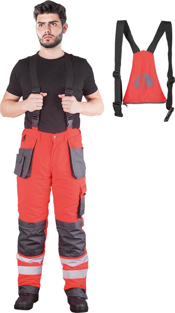 Spodnie ochronne ocieplane z odpinanymi szelkami, wieloma kieszeniami i dodatkowymi wzmocnieniami. Idealne do pracy w trudnych warunkach.