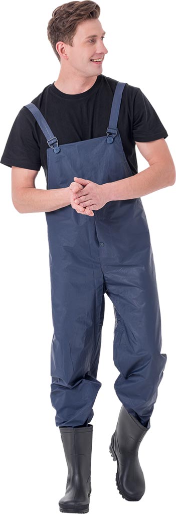 Ogrodniczki przeciwdeszczowe dla mężczyzn z regulacją, wykonane z mieszanki PVC i poliestru, zapewniające ochronę i komfort.